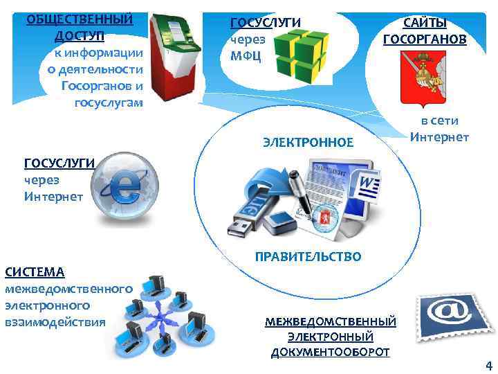 ОБЩЕСТВЕННЫЙ ДОСТУП к информации о деятельности Госорганов и госуслугам ГОСУСЛУГИ через МФЦ САЙТЫ ГОСОРГАНОВ ЭЛЕКТРОННОЕ в сети Интернет ГОСУСЛУГИ через Интернет СИСТЕМА межведомственного электронного взаимодействия ПРАВИТЕЛЬСТВО МЕЖВЕДОМСТВЕННЫЙ ЭЛЕКТРОННЫЙ ДОКУМЕНТООБОРОТ 4