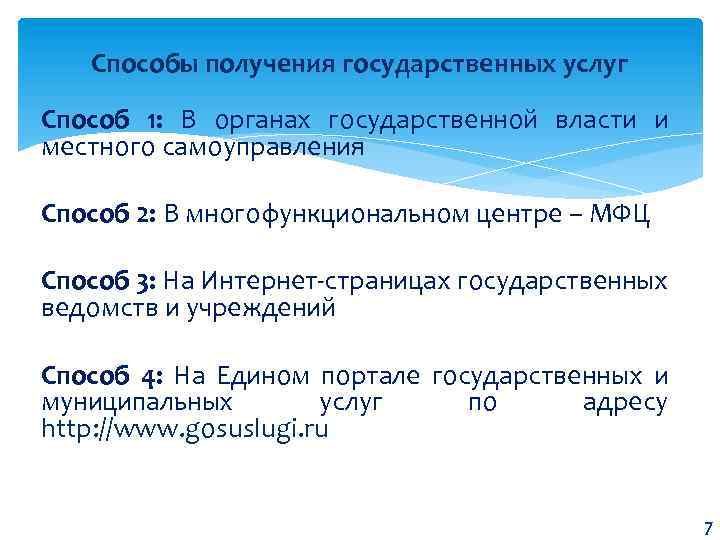 Способы получения государственных услуг Способ 1: В органах государственной власти и местного самоуправления Способ 2: В многофункциональном центре – МФЦ Способ 3: На Интернет-страницах государственных ведомств и учреждений Способ 4: На Едином портале государственных и муниципальных услуг по адресу http: //www. gosuslugi. ru 7