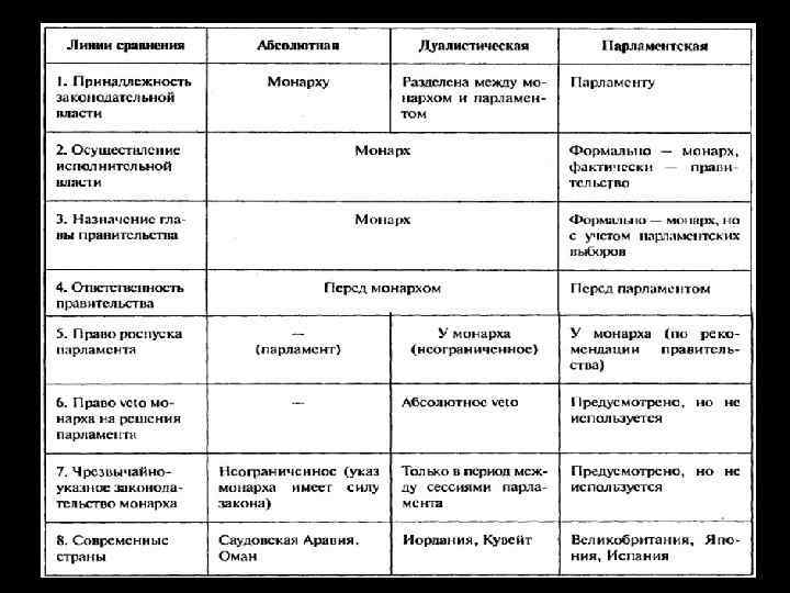 ПАРЛАМЕНТАРНАЯ МОНАРХИЯ отличается тем, что статус монарха как юридически, так и фактически, ограничен во всех сферах государственной власти, в том числе, в законодательной и исполнительной. Монарх играет преимущественно представительскую или церемониальную роль. При парламентарной монархии правительство ответственно перед парламентом, которому принадлежит формальное верховенство среди других органов государства.