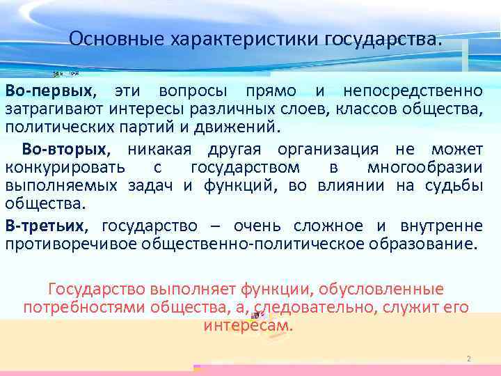 Основные характеристики государства. Во-первых, эти вопросы прямо и непосредственно затрагивают интересы различных слоев, классов общества, политических партий и движений. Во-вторых, никакая другая организация не может конкурировать с государством в многообразии выполняемых задач и функций, во влиянии на судьбы общества. В-третьих, государство – очень сложное и внутренне противоречивое общественно-политическое образование. Государство выполняет функции, обусловленные потребностями общества, а, следовательно, служит его интересам. 2