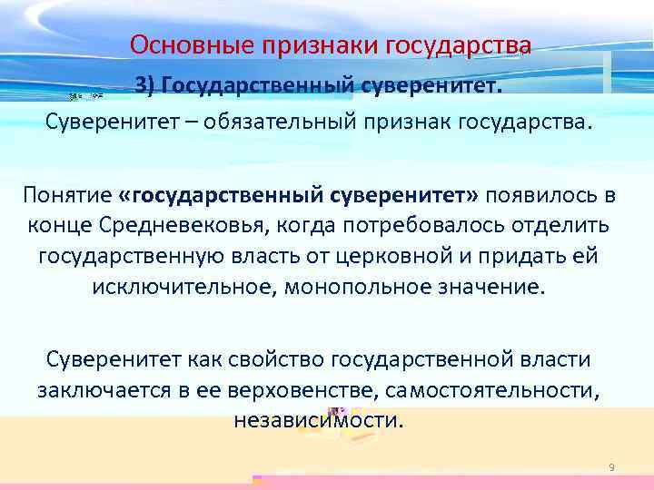 Основные признаки государства 3) Государственный суверенитет. Суверенитет – обязательный признак государства. Понятие «государственный суверенитет» появилось в конце Средневековья, когда потребовалось отделить государственную власть от церковной и придать ей исключительное, монопольное значение. Суверенитет как свойство государственной власти заключается в ее верховенстве, самостоятельности, независимости. 9