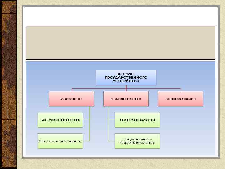 Унитарные государства централизованные органы власти административнотерриториальных единиц формируются центром органы власти административнотерриториальных единиц избираются населением Большинство всех государств - унитарные, эта форма государственного устройства обеспечивает хорошую управляемость и государственное единство, оно идеально подходит для государств с небольшой или средней территорией