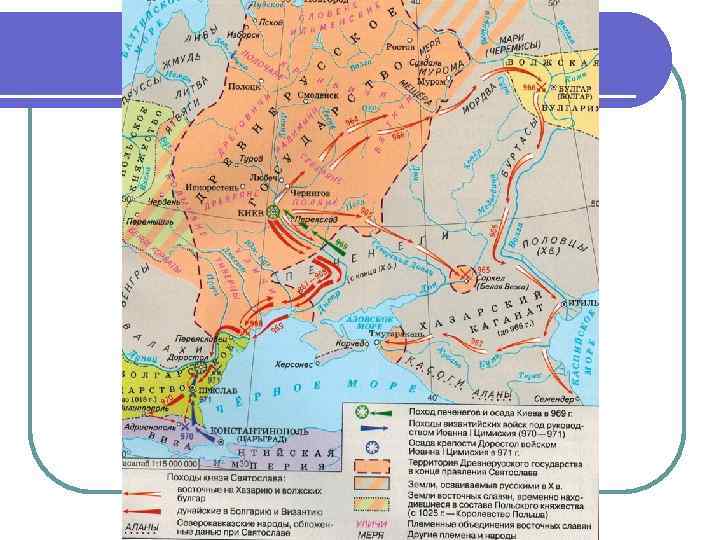 Правление князя Святослава Игоревича (945 -972 гг. ) Н. Карамзин называл Святослава «Александром Македонским нашей древней истории» l 964 -966 гг. – захват Святославом земель вятичей, разгром сил волжских болгар, уничтожение Хазарского каганата. Было положено начало древнерусскому Тмутараканскому княжеству, взятие важного города Саркел (Белая Вежа) на Дону. l В итоге волжский торговый путь в значительной мере оказался под контролем Руси l