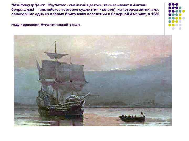"Мэйфлауэр"(англ. Mayflower - «майский цветок» , так называют в Англии боярышник) — английское торговое судно (тип - галеон), на котором англичане, основавшие одно из первых британских поселений в Северной Америке, в 1620 году пересекли Атлантический океан.