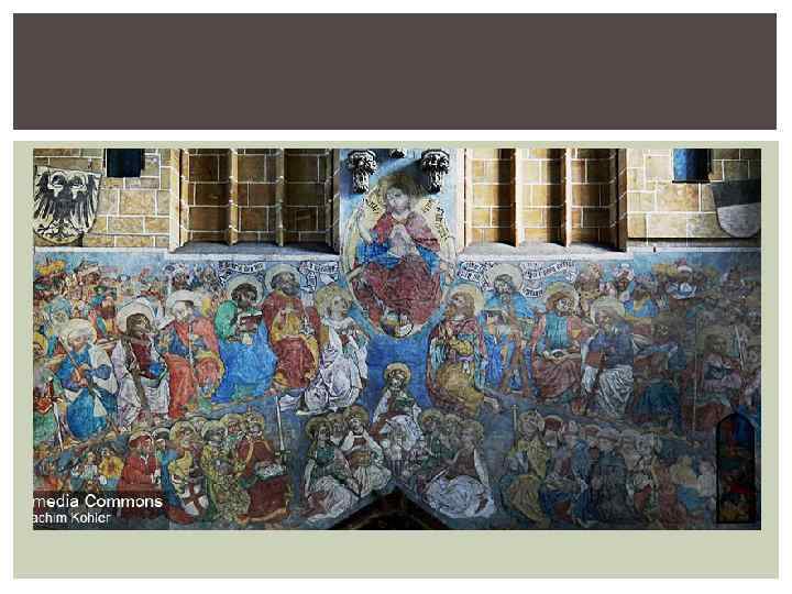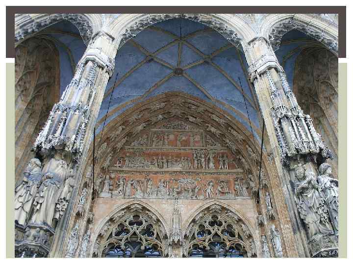 СЕВЕРО-ЗАПАДНЫЙ ПОРТАЛ Небольшой северо-западный Малый портал Марии посвящен рождеству Иисуса Христа и поклонению волхвов. Тимпан (1356) был перемещен сюда из старой приходской церкви Ульма. Северо-восточный портал Реформационный портал (1370) изображает сцены страстей Христовых. На юговосточном портале (1360) можно увидеть сцены страшного суда. Он также был перенесен сюда со старой приходской церкви. Самый пышный и большой портал собора – югозападный Большой портал девы Марии, который, видимо, задумывался как главный. Тимпан (1380) изображает сцены из жития пресвятой девы Марии. Ниже находятся три барельефа (около 1400). На левом изображено поклонение волхвов, на правом рождение Христа, а на среднем шествие трех волхвов к святому младенцу.