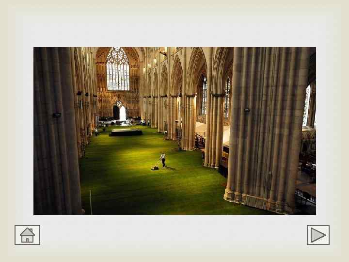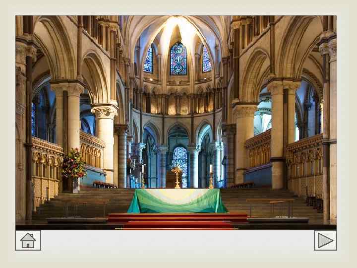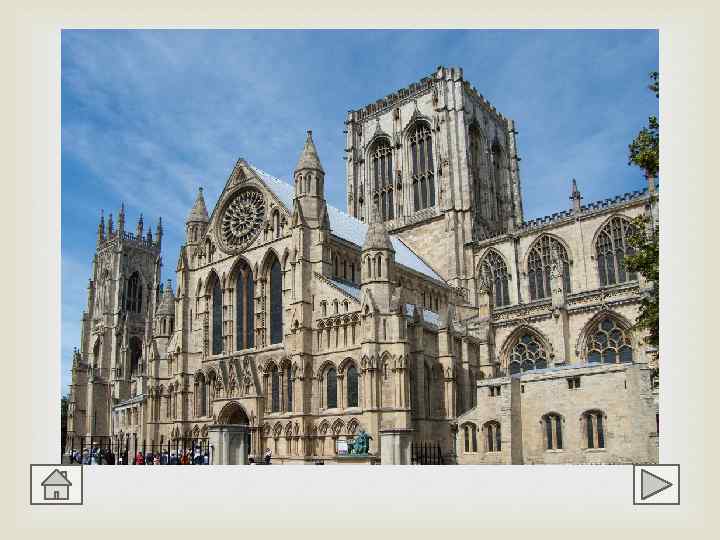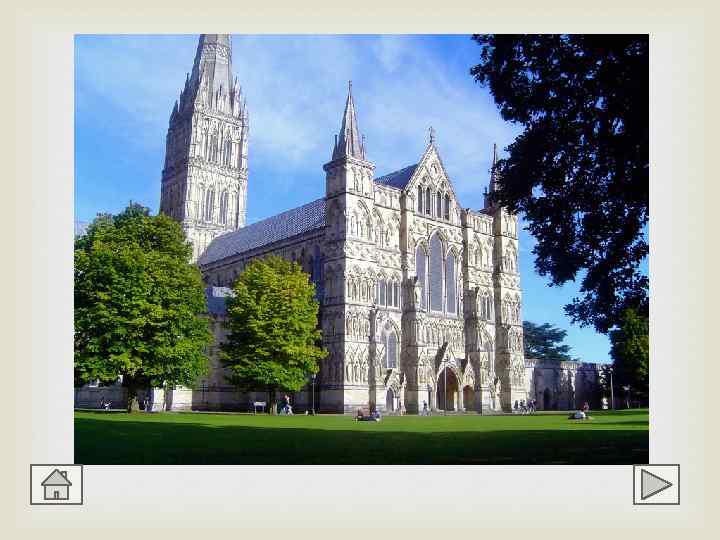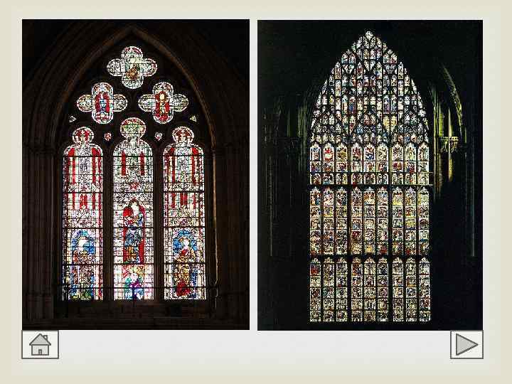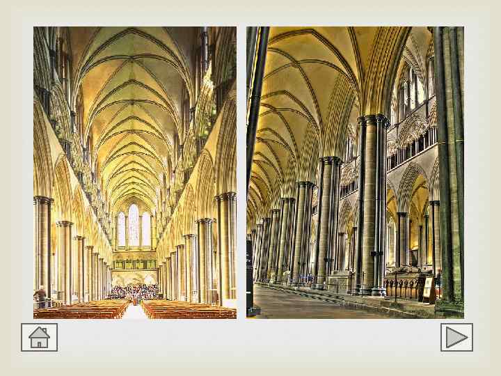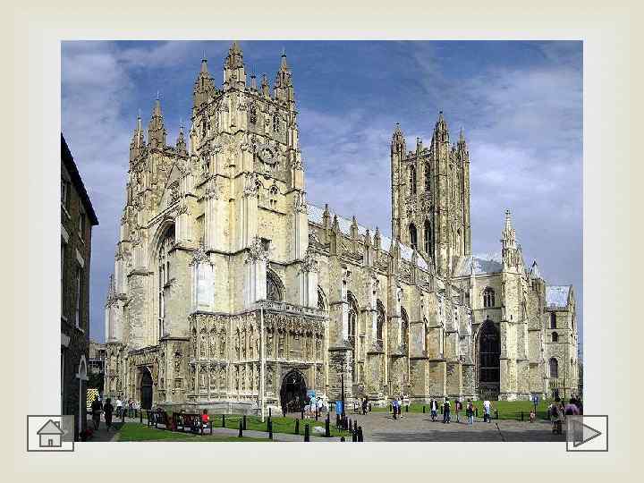 Английская готика Готика Англии возникла очень рано (в конце XII в. ) и существовала до XVI в. Доминанта собора — огромная башня. В отличие от французской, английская готика не была тесно связана с конструкцией, хранила прямоугольные, удлиненные объемы. Фон заполняли декоративными элементами, что на фасадах образовывали экраны-декорации. По ним трудно было предположить построение интерьера. Декор (форма окон, рисунки оконных перегородок и т. п. ) преобладает и первым бросается в глаза. Солсберийский собор Йоркский собор Кентерберийский собор