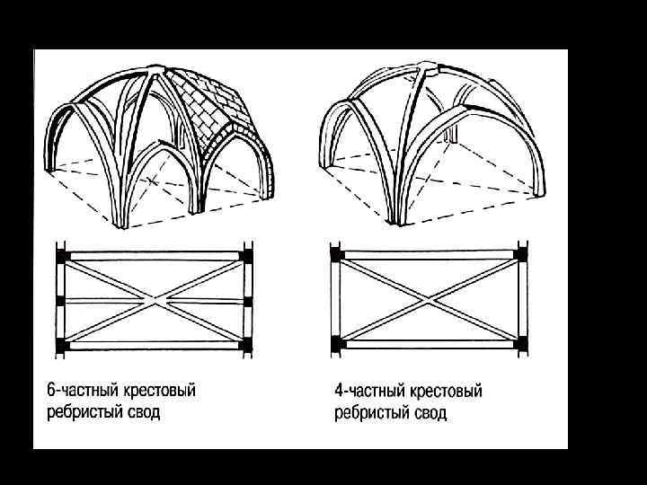 Основные разновидности перекрытий готических травей, с пятью или шестью крестовыми сводами. Планы травей, аксонометрии сводов центрального нефа. Травея с четырехчастными сводами в центральном нефе Травея с шестичастными сводами в центральном нефе