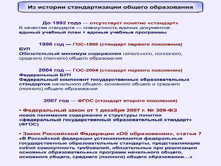 ПРАКТИКА СТАНДАРТИЗАЦИИ В РОССИИ - 1993 год – разработка первого варианта Концепции федеральных компонентов образовательного стандарта и Базисного учебного плана (руководитель работ В. С. Леднёв, академик, д. п. н. , профессор); - 1996 год – разработка проекта Закона о стандартах общего образования; - 1998 год – выход приказа Министерства образования РФ «Обязательный минимум содержания начального общего, основного общего, среднего (полного) общего образования» ;