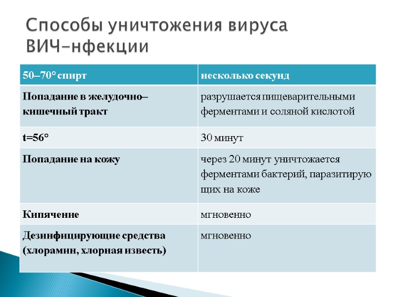Уменьшение числа половых партнеров, в идеальном случае до одного. Безопасный секс. Применение одноразовых шприцов при медицинских процедурах. Анализ крови на ВИЧ – инфекцию 1 раз в год. Не употреблять наркотики. Систематическая дезинфекция инструментов (парикмахерских, для маникюра и педикюра)