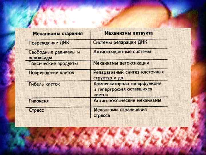 В ходе эволюции на ряду со старением возник и процесс Витакута. ВИТАУКТ – (от лат. vita жизнь и aucto непре рывно увеличиваю, приумножаю) целостные про цессы, направленные на стабилизацию жизнеспособ ности организма. Современные геронтологи считают (Флоркис, 1985), что в соответствии с адаптационно регуляторной теорией наряду со ста рением развивается процесс. Витаукта. Это представление определило тактику и стратегию решения данной проблемы замедлить темп старения и максимально оптимизировать процесс Витаукта, используя адаптационные возможности организма.