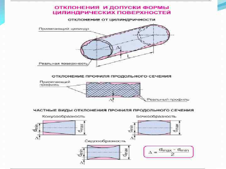 Продолжение 1 вопроса Рис. 1. 7. Отклонение от круглости: а - общий случай; б- овальность; в - огранка; г - отклонение от цилиндричности; 1, 3 - номинальные профили; 2, 4 - реальные профили; Δ отклонение реального профиля от номинального; dmin,