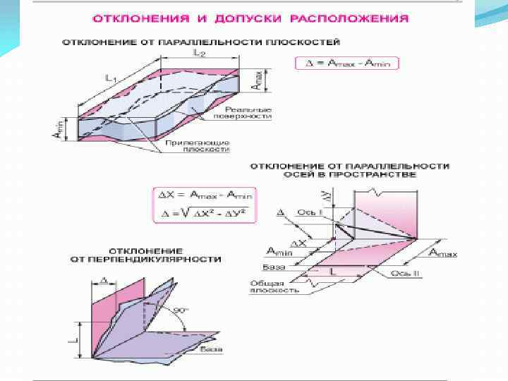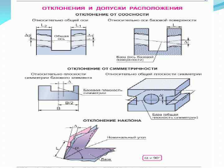 Продолжение 1 вопроса К отклонениям взаимного расположения поверхностей относятся отклонения от параллельности, перпендикулярности, угла расположения, соосности, концентричности. Незначительные отклонения реальной поверхности от номинальной в виде неровностей с относительно малыми расстояниями между ними называются шероховатостью.