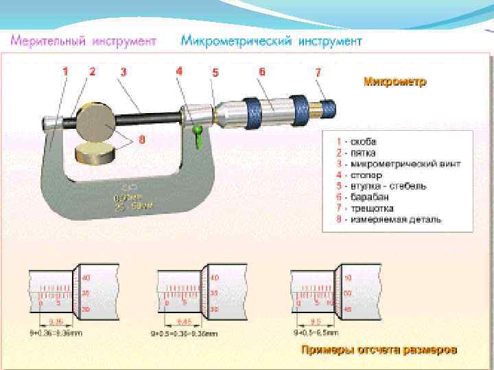 Микрометрические инструменты предназначены для абсолютных измерений наружных и внутренних размеров, высот уступов, глубин отверстий и т. д. Микрометры гладкие МК предназначены для измерения наружных размеров.