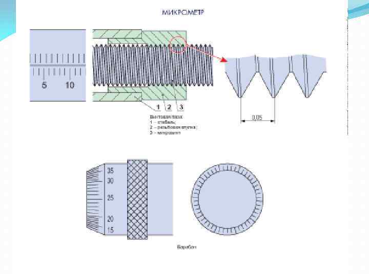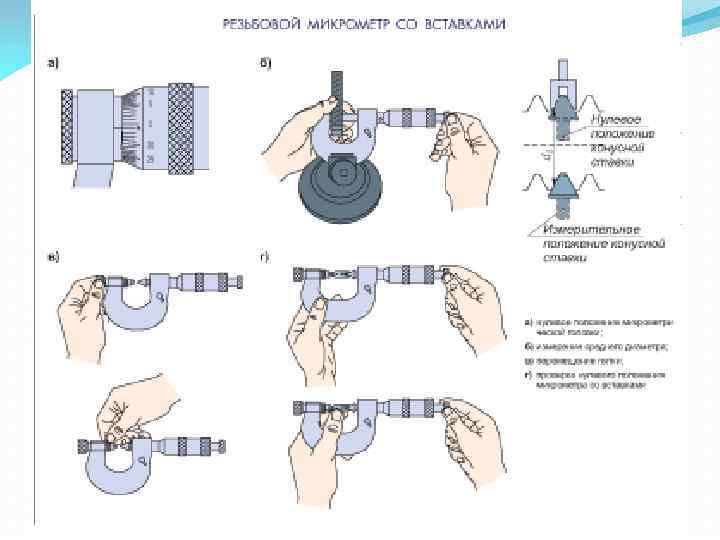 Резьбовой микрометр предназначен для измерения среднего диаметра треугольной наружной резьбы. Он отличается от обычного тем, что в пятке и стержне микрометрического винта имеются отверстия, в которые устанавливают призматическую и коническую вставки с углами, равными углу профиля резьбы.