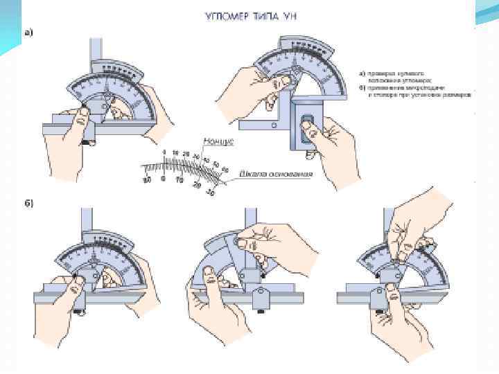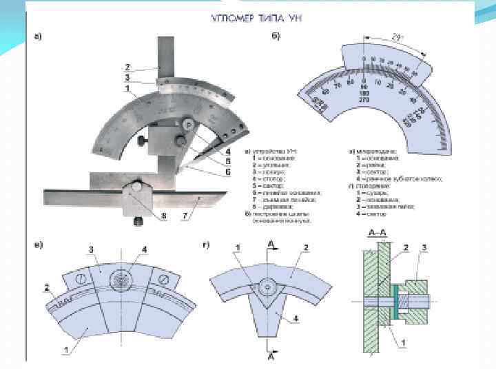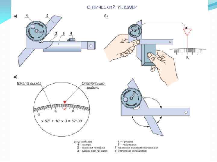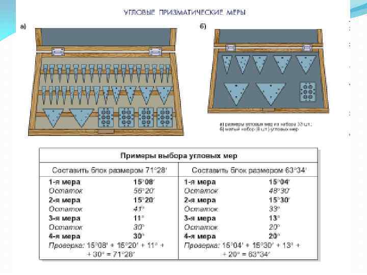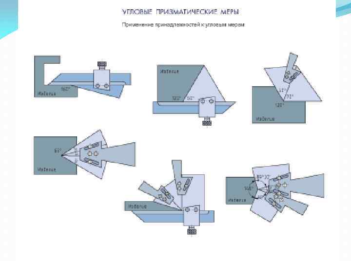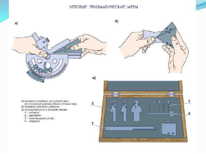 Продолжение 1 вопроса Угловые меры и угольники Угловые меры (рис. 1. 19, а) изготавливают в виде прямых призм и применяют для контроля углов и градуировки угломерных инструментов и угловых шаблонов. Рис. 1. 19. Угловые меры (а) и державки для их применения (бг)