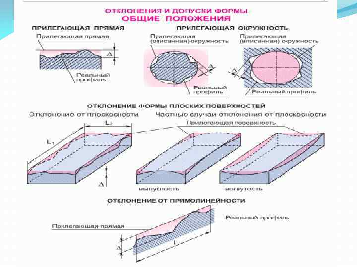 Продолжение 1 вопроса Рис. 1. 6. Отклонение плоских поверхностей от формы: а-д - отклонение от прямолинейности; е-з отклонение от плоскостности; 1 реальный профиль; 2 прилегающая (номинальная) прямая; 3, 5 - реальные оси; 4 номинальная ось; б реальная поверхность; 7 номинальная поверхность; L, L L - длина