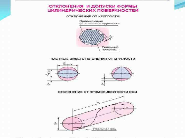 Продолжение 1 вопроса К отклонениям относятся отклонения действительных (измеренных) размеров детали от номинальных, отклонения во взаимном расположении поверхностей обработанной детали (отклонения от параллельности, перпендикулярности, заданных углов наклона одной поверхности относительно другой), волнистость поверхности и ее шероховатость. К отклонениям формы относятся отклонения от прямолинейности, плоскостности, круглости, цилиндричности и отклонение профиля продольного сечения.