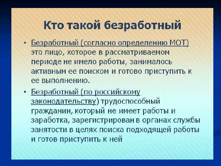Порядок и условия признания гражданина безработным n n n Безработными признаются граждане, которые: а) являются трудоспособными; б) не имеют работы и заработка (при этом не учитывается выходное пособие и средний заработок, выплачиваемые при высвобождении с предприятий, а также оплата за выполнение общественных работ по направлению службы занятости); в) зарегистрированы в службе занятости; г) готовы приступить к работе. Безработными не могут быть признаны граждане: — не достигшие 16 -летнего возраста, а также граждане, которым назначена пенсия; — отказавшиеся в течение 10 дней со дня обращения в службу занятости от двух вариантов подходящей работы. Гражданину не может быть предложена одна и та же работа дважды. Главный признак подходящей работы — ее соответствие профессиональной пригодности работника, при этом учитываются уровень профессиональной подготовки, прежняя работа, состояние здоровья, транспортная доступность рабочего места.