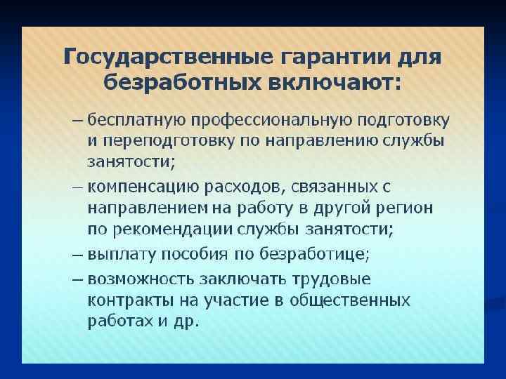 Обязанности органов службы занятости n n n анализировать, прогнозировать спрос и предложение на рабочую силу и информировать о состоянии рынка труда; вести учет свободных рабочих мест и трудоустраиваемых граждан; информировать граждан и работодателей о возможностях получения работы и обеспечения рабочей силой; помогать гражданам в поиске подходящей работы, а работодателям — в подборе необходимых работников; организовывать профподготовку, переобучение и повышение квалификации безработных граждан в учебных центрах органов занятости и других учебных заведениях; оказывать услуги в профессиональной ориентации и трудоустройстве высвобождаемым работникам и другим категориям населения; регистрировать безработных и оказывать им помощь; разрабатывать федеральные, территориальные (республиканские и региональные) программы занятости граждан; оплачивать стоимость профподготовки и переподготовки граждан, если их трудоустройство требует этого, и устанавливать им стипендии на время обучения и выплачивать их; назначать пособия по безработице и приостанавливать их выплату; устанавливать надбавки на иждивенцев к этим пособиям;