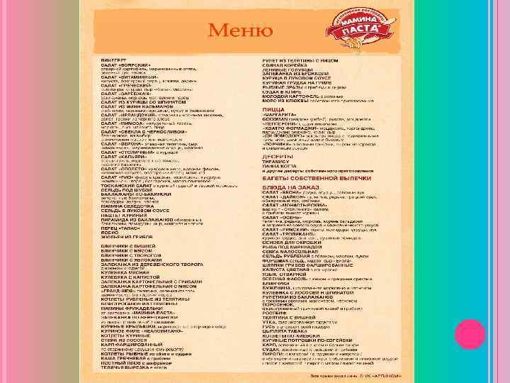 Я ПРОХОДИЛА ПРАКТИКУ В РЕСТОРАНЕ «МАМИНА ПАСТА» АДРЕС: СПИРИДОНЬЕВСКИЙ ПЕРЕУЛОК ДОМ 129 ПРОЕЗД СТ. М. ПУШКИНСКАЯ» ВЫХОД К ТЕАТРУСТАНИСЛАВСКОМУ С « УЛ. ТВЕРСКАЯ, ПОВОРОТ В ПЕРВУЮ АРКУ ТЕЛЕФОН: 8 -495 -64 -880 -64