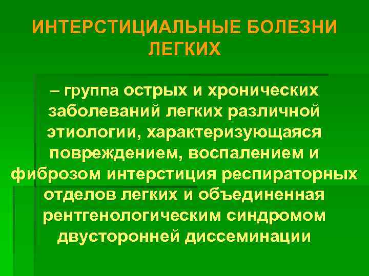 ИНТЕРСТИЦИАЛЬНЫЕ БОЛЕЗНИ ЛЕГКИХ – группа острых и хронических заболеваний легких различной этиологии, характеризующаяся повреждением, воспалением и фиброзом интерстиция респираторных отделов легких и объединенная рентгенологическим синдромом двусторонней диссеминации
