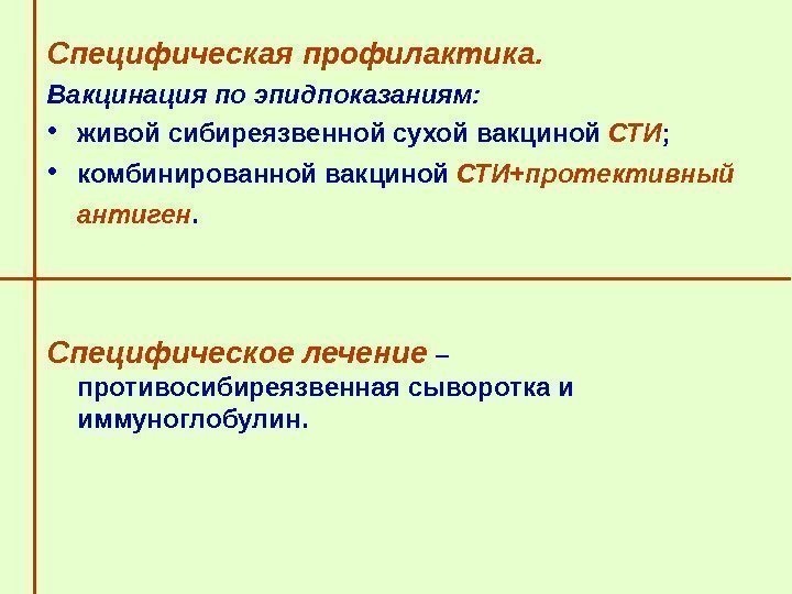 Специфическая профилактика. Вакцинация по эпидпоказаниям: • живой сибиреязвенной сухой вакциной СТИ ; • комбинированной вакциной СТИ+протективный антиген. Специфическое лечение – противосибиреязвенная сыворотка и иммуноглобулин.
