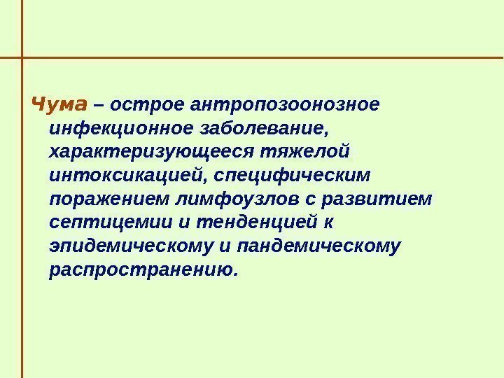 Чума – острое антропозоонозное инфекционное заболевание, характеризующееся тяжелой интоксикацией, специфическим поражением лимфоузлов с развитием септицемии и тенденцией к эпидемическому и пандемическому распространению.
