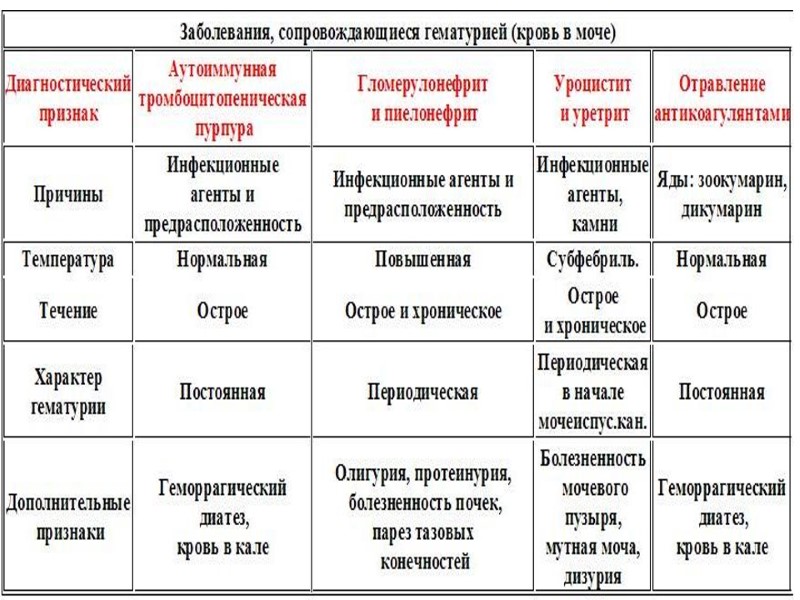 Гематурия - выделение крови с мочой. видимая невооруженным глазом (макрогематурия); различимая лишь при микроскопии (микрогематурия). тотальная макрогематурия - моча окрашена кровью на протяжении всего акта мочеиспускания с одинаковой интенсивностью; инициальная (начальная) макрогематурия - только первая порция мочи окрашена кровью; терминальная (конечная) макрогематурия - кровь выделяется лишь в конце акта мочеиспускания.