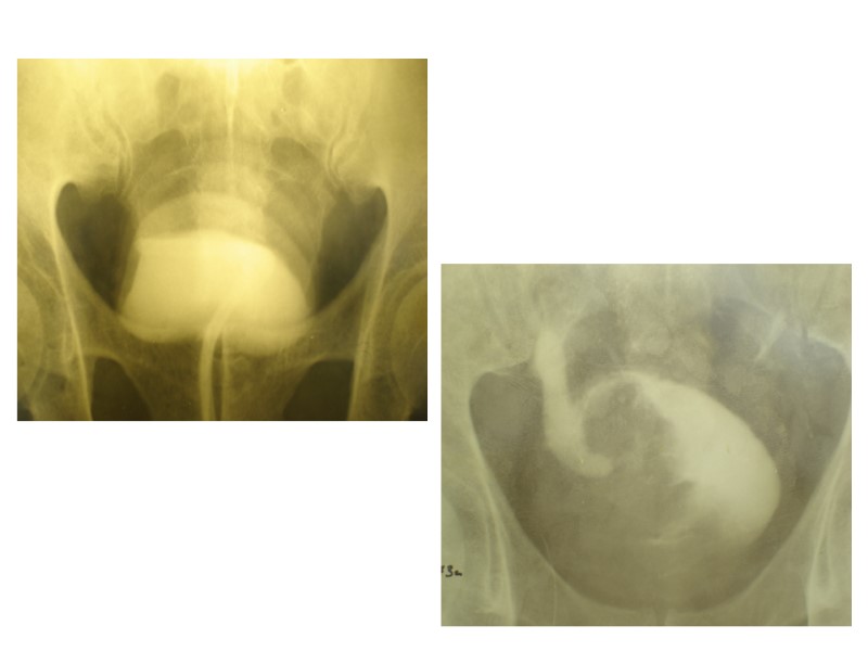 Уретрография Рак шейки мочевого пузыря. Дефект наполнения с фестончатыми контурами в области шейки мочевого пузыря (а). Удлинена pars retrocollicularis (б), скопление контрастного вещества в области семенного бугорка (в).