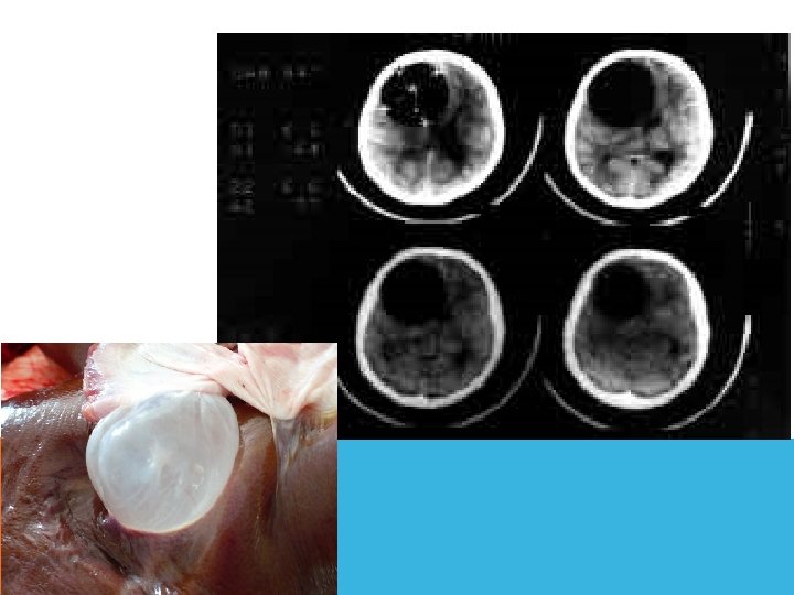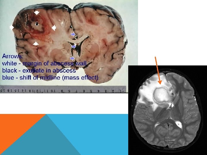 Патогенез Рост микроорганизмов. Локализованный энцефалит (церебрит) с отеком мозга. Гнойное расплавление очага Формирование капсулы. Клиническая картина Общеинфекционные симптомы (недомогание, лихорадка, тахикардия и т. д. ) Внутричерепная гипертензия Очаговые неврологические симптомы в зависимости от локализации абсцесса (эпилептические припадки, парезы, гемианопсия, афазии, мозжечковая симптоматика)