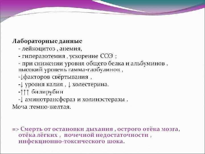 Стадии комы В терминальной фазе наблюдается: *зрачки расширяются не реагируют на свет; *прогрессирование желтухи, печеночного запаха, явлений геморрагического диатеза, *гипертермия; * часто присоединяется инфекция с явлениями сепсиса.