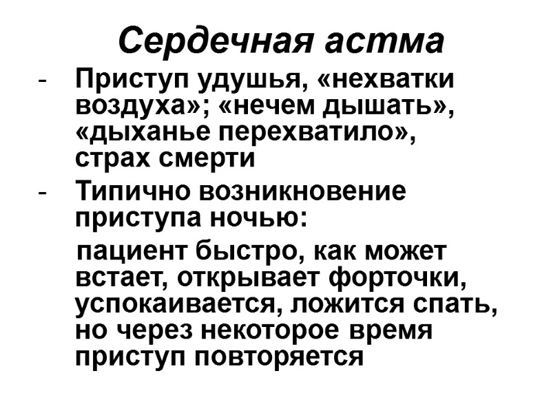 Сердечная астма Приступ удушья, «нехватки воздуха»; «нечем дышать», «дыханье перехватило», страх смерти Типично возникновение приступа ночью: пациент быстро, как может встает, открывает форточки, успокаивается, ложится спать, но через некоторое время приступ повторяется