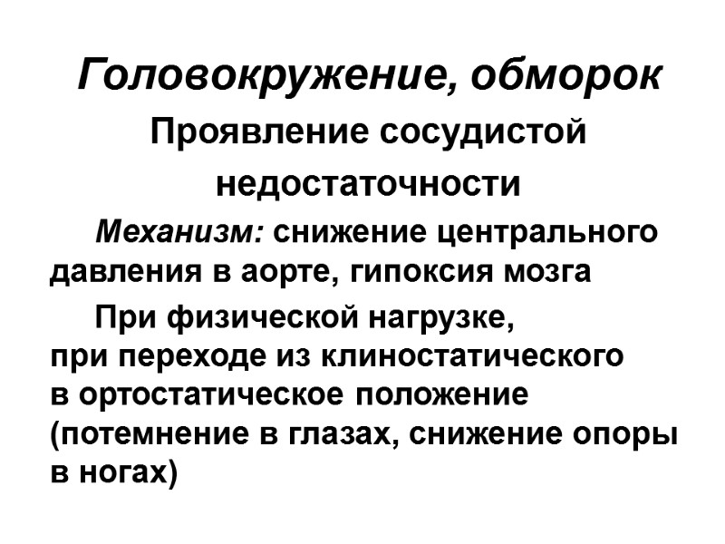 Головокружение, обморок Проявление сосудистой недостаточности Механизм: снижение центрального давления в аорте, гипоксия мозга При физической нагрузке, при переходе из клиностатического в ортостатическое положение (потемнение в глазах, снижение опоры в ногах)