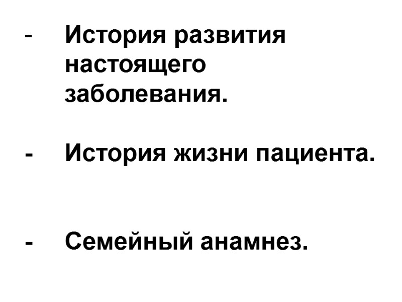 История развития настоящего заболевания. - История жизни пациента. - Семейный анамнез.