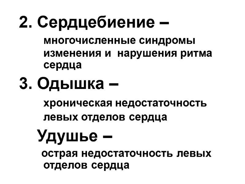 2. Сердцебиение – многочисленные синдромы изменения и нарушения ритма сердца 3. Одышка – хроническая недостаточность левых отделов сердца Удушье – острая недостаточность левых отделов сердца