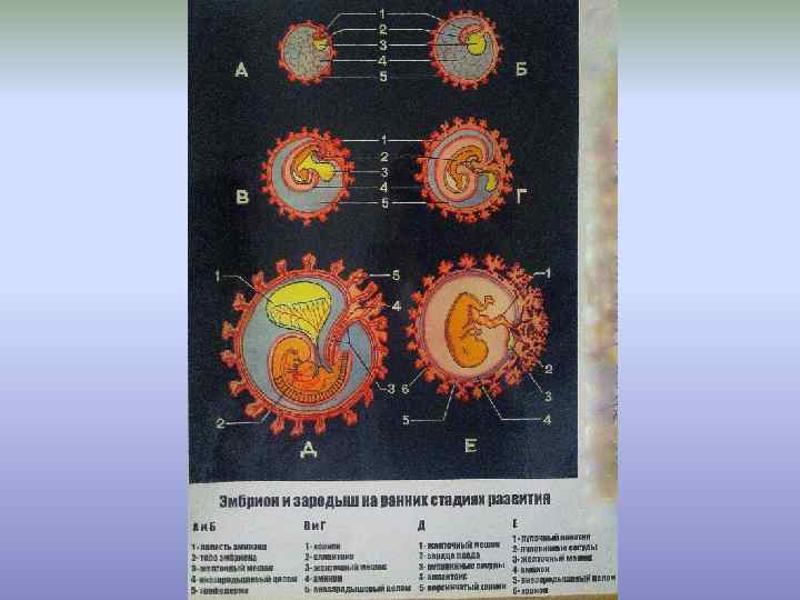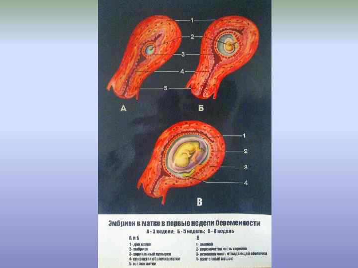 • Имплантация человеческого яйца 1 - тофобласт 2 - фибриновая пленка 3 - зародыш 4 - место нидации яйца 5 - аллантоисный стебелёк