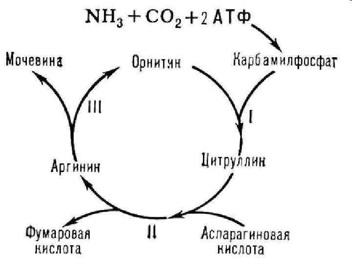 NH 3 CO 2 малат 3 АТФ цтк Орнитиновый цикл аспаратат фумарат МОЧЕВИНА COOH H 2 O CH CH COOH НАДН 2 CHOH фумараза COOH ФУМАРАТ CH 2 COOH МАЛАТ оксалоацетат ГЛУ COOH C=O МАЛАТ ДГ кетоглутарат ГЛУ COOH - КЕТОГЛУ CHNH 2 Ас. АТ CH 2 COOH оксалоацетат АСП