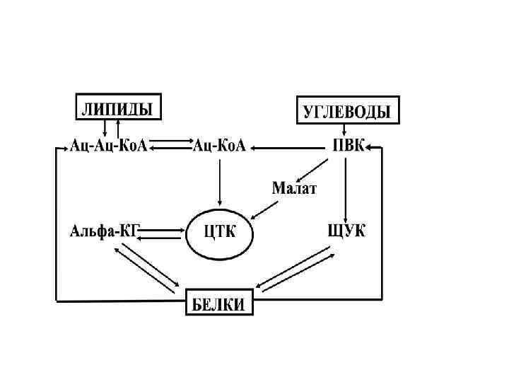 • Ограниченное число типов обменных процессов (катаболизм, анаболизм : белковый, липидный, углеводный) • Наличие узлов связи и прямого взаимодействия между этими процессами (Ас-Ко. А, реципрокные взаимоотношения м -ду гликолизом и гликонеогенезом). • «Мосты» между разными процессами, сокращающие и без того небольшое число различных путей обмена.