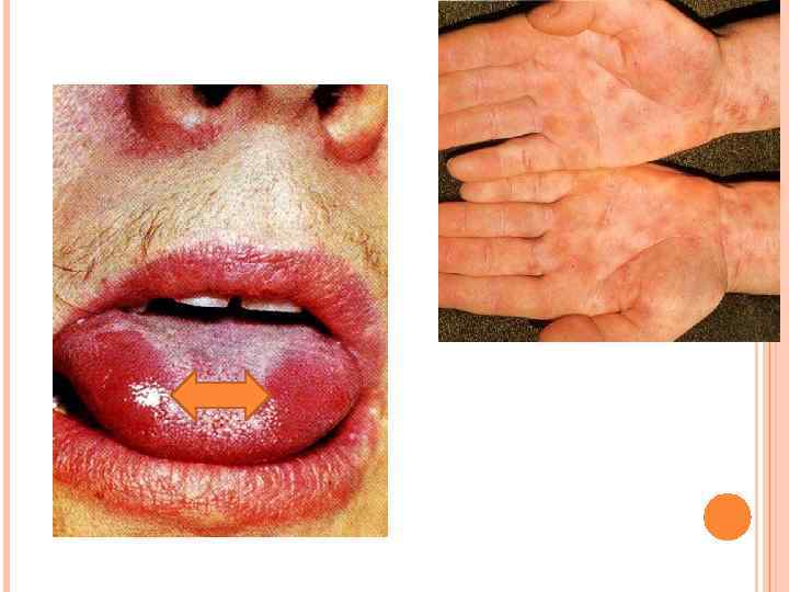 ДИФФЕРЕНЦИАЛЬНАЯ ДИАГНОСТИКА. ВТОРИЧНЫЙ СИФИЛИС. Сифилитические папулы Белесоватый налет довольно легко снимается при поскабливании; имеется инфильтрация; по краям очага имеется воспалительный ободок Лейкоплакия, Красный плоский лишай, Красная волчанка Удалить налет не удается, поскольку он является следствием гиперкератоза; отсутствует инфильтрация, а по краям очага нет воспалительного ободка Сифилитические папулы После удаления серовато-белого налета обнажается эрозия, в отделяемом которой обнаруживаются бледные трепонемы Кандидоз Соскабливание налета при кандидозе обнажает гиперемированную поверхность слизистой оболочки, иногда эрозированную; в отделяемом обнаруживаются грибы рода Candida Сифилитические папулы на спинке языка Десквамативный глоссит Ярко-красный цвет участков десквамации, наличие белой каймы по периферии, отсутствие уплотнения в основании, миграция очагов десквамации и хроническое течение заболевания