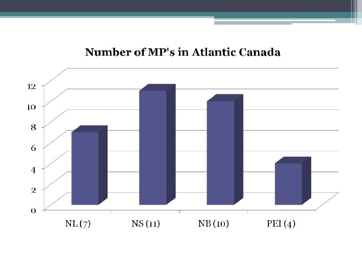 Members of Parliament • Currently, there are 308 MP’s in the House of Commons (a record 69 are women) • Each province has a certain number of MP’s, according to their population.