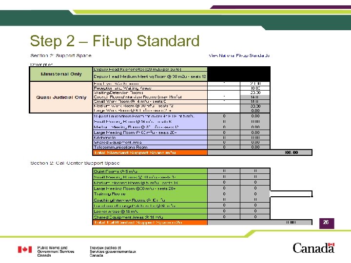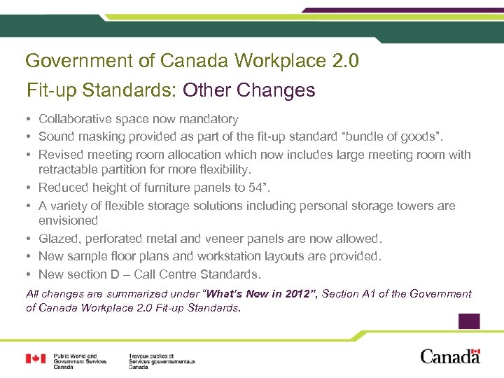 Government of Canada Workplace 2. 0 Fit-up Standards: Other Changes • Collaborative space now mandatory • Sound masking provided as part of the fit-up standard “bundle of goods”. • Revised meeting room allocation which now includes large meeting room with retractable partition for more flexibility. • Reduced height of furniture panels to 54”. • A variety of flexible storage solutions including personal storage towers are envisioned • Glazed, perforated metal and veneer panels are now allowed. • New sample floor plans and workstation layouts are provided. • New section D – Call Centre Standards. All changes are summarized under “What’s New in 2012”, Section A 1 of the Government of Canada Workplace 2. 0 Fit-up Standards.