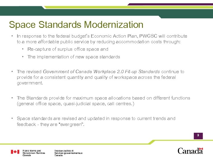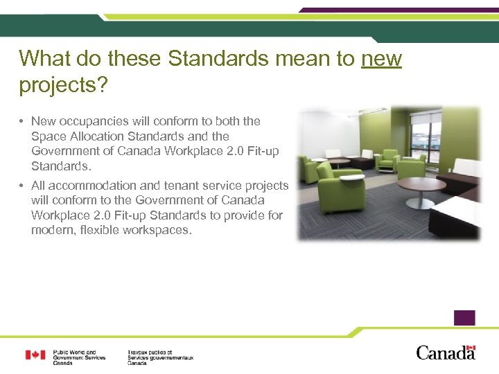 What do these Standards mean to new projects? • New occupancies will conform to both the Space Allocation Standards and the Government of Canada Workplace 2. 0 Fit-up Standards. • All accommodation and tenant service projects will conform to the Government of Canada Workplace 2. 0 Fit-up Standards to provide for modern, flexible workspaces.