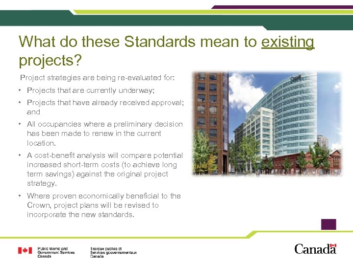 What do these Standards mean to existing projects? Project strategies are being re-evaluated for: • Projects that are currently underway; • Projects that have already received approval; and • All occupancies where a preliminary decision has been made to renew in the current location. • A cost-benefit analysis will compare potential increased short-term costs (to achieve long term savings) against the original project strategy. • Where proven economically beneficial to the Crown, project plans will be revised to incorporate the new standards.