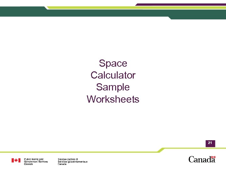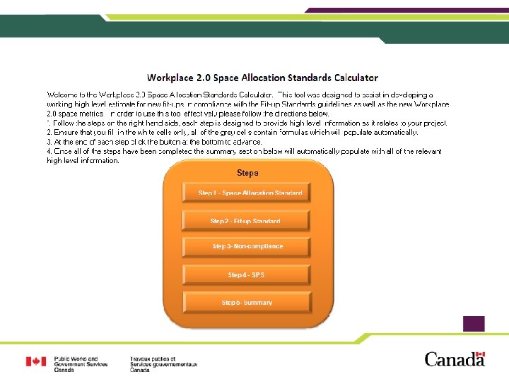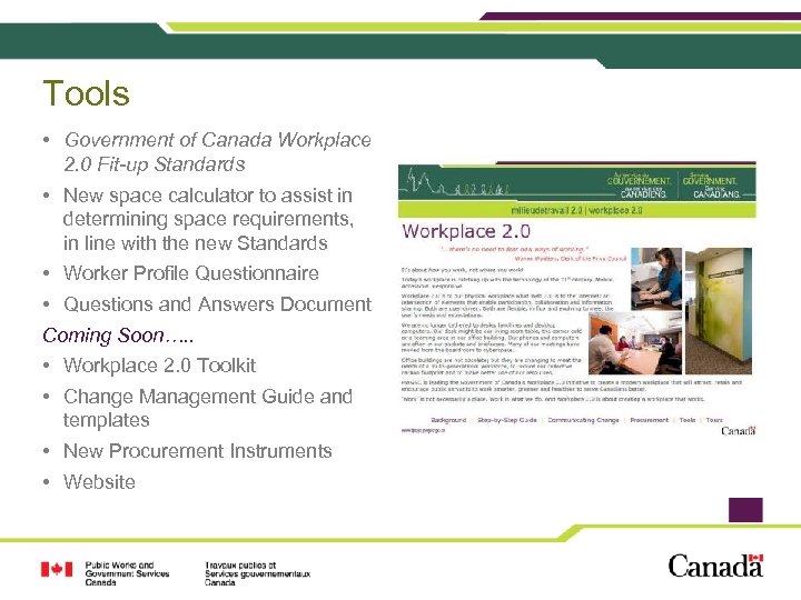 Tools • Government of Canada Workplace 2. 0 Fit-up Standards • New space calculator to assist in determining space requirements, in line with the new Standards • Worker Profile Questionnaire • Questions and Answers Document Coming Soon…. . • Workplace 2. 0 Toolkit • Change Management Guide and templates • New Procurement Instruments • Website