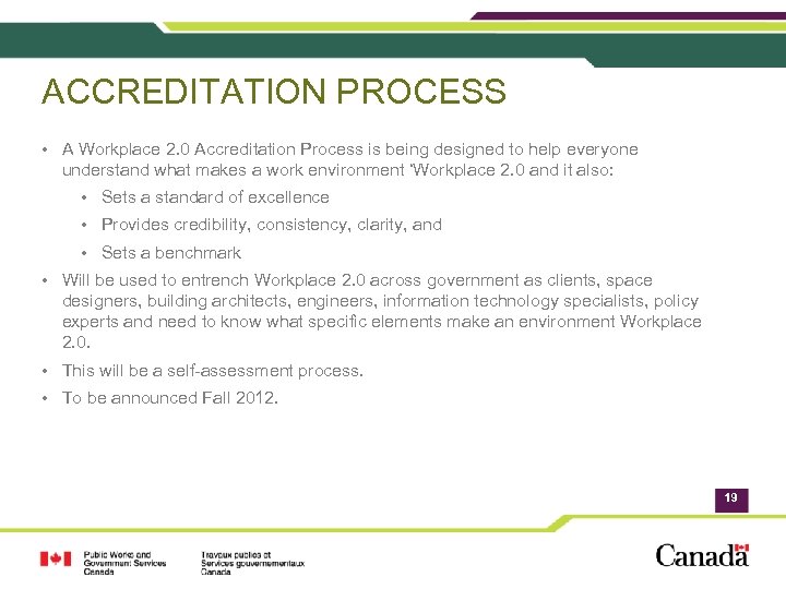 ACCREDITATION PROCESS • A Workplace 2. 0 Accreditation Process is being designed to help everyone understand what makes a work environment ‘Workplace 2. 0 and it also: • Sets a standard of excellence • Provides credibility, consistency, clarity, and • Sets a benchmark • Will be used to entrench Workplace 2. 0 across government as clients, space designers, building architects, engineers, information technology specialists, policy experts and need to know what specific elements make an environment Workplace 2. 0. • This will be a self-assessment process. • To be announced Fall 2012. 19