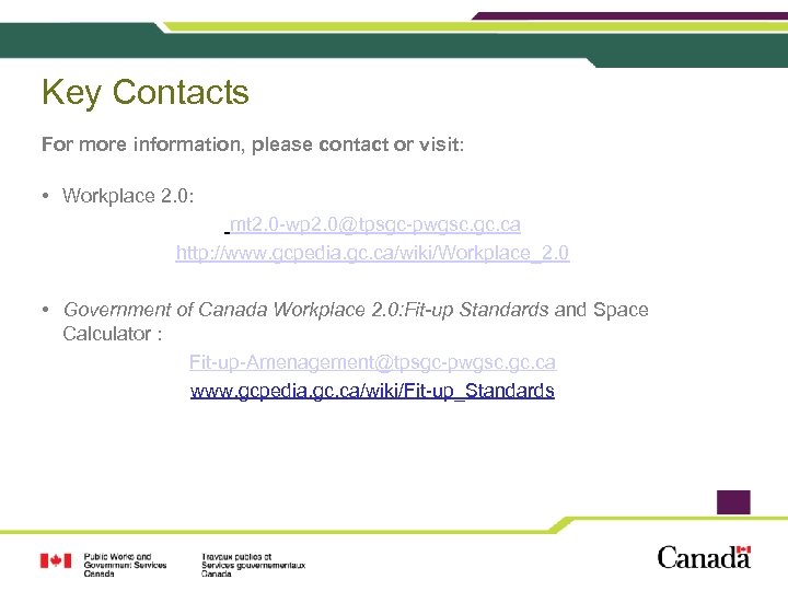 Key Contacts For more information, please contact or visit: • Workplace 2. 0: mt 2. 0 -wp 2. 0@tpsgc-pwgsc. gc. ca http: //www. gcpedia. gc. ca/wiki/Workplace_2. 0 • Government of Canada Workplace 2. 0: Fit-up Standards and Space Calculator : Fit-up-Amenagement@tpsgc-pwgsc. gc. ca www. gcpedia. gc. ca/wiki/Fit-up_Standards