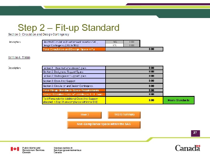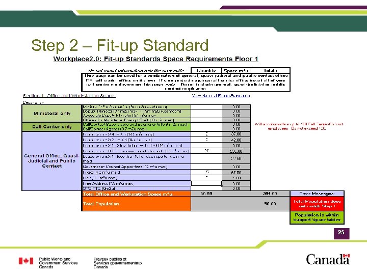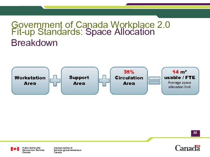 Government of Canada Workplace 2. 0 Fit-up Standards: Space Allocation Breakdown Workstation Area Support Area 35% Circulation Area 14 m² usable / FTE Average space allocation limit 22