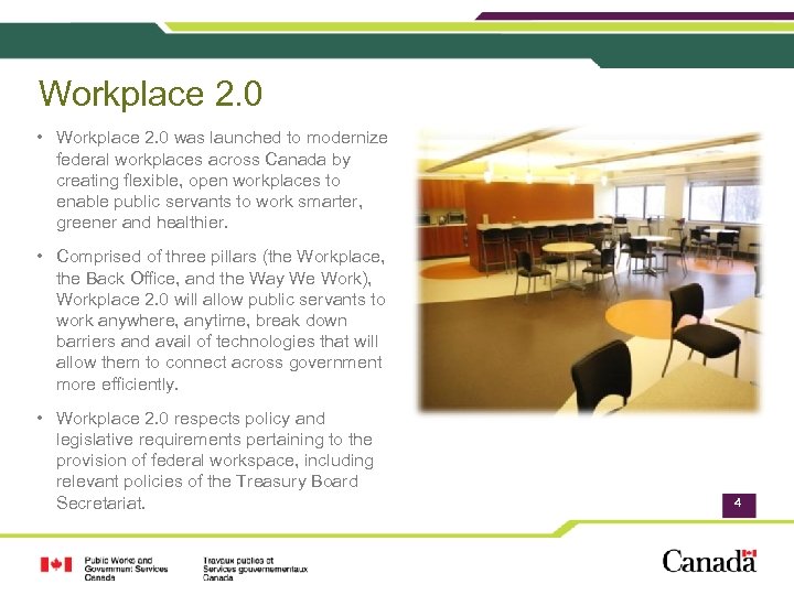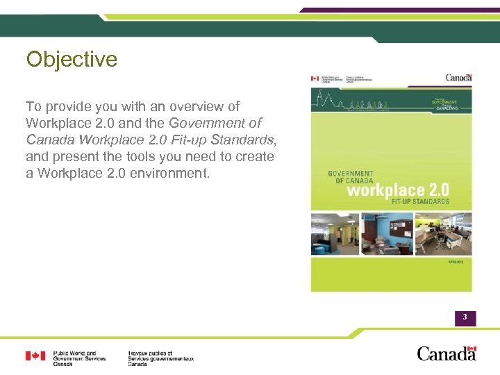 Objective To provide you with an overview of Workplace 2. 0 and the Government of Canada Workplace 2. 0 Fit-up Standards, and present the tools you need to create a Workplace 2. 0 environment. 3