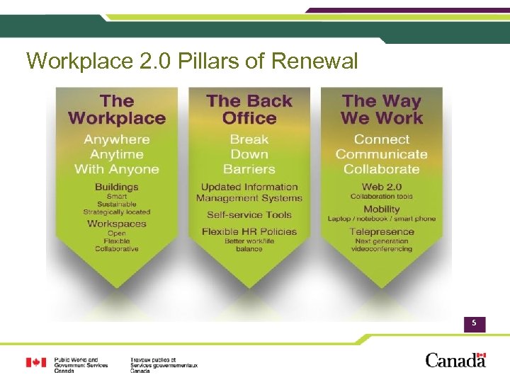Workplace 2. 0 • Workplace 2. 0 was launched to modernize federal workplaces across Canada by creating flexible, open workplaces to enable public servants to work smarter, greener and healthier. • Comprised of three pillars (the Workplace, the Back Office, and the Way We Work), Workplace 2. 0 will allow public servants to work anywhere, anytime, break down barriers and avail of technologies that will allow them to connect across government more efficiently. • Workplace 2. 0 respects policy and legislative requirements pertaining to the provision of federal workspace, including relevant policies of the Treasury Board Secretariat. 4