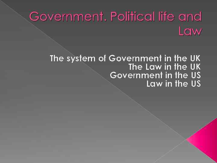 Government. Political life and Law The system of Government in the UK The Law in the UK Government in the US Law in the US